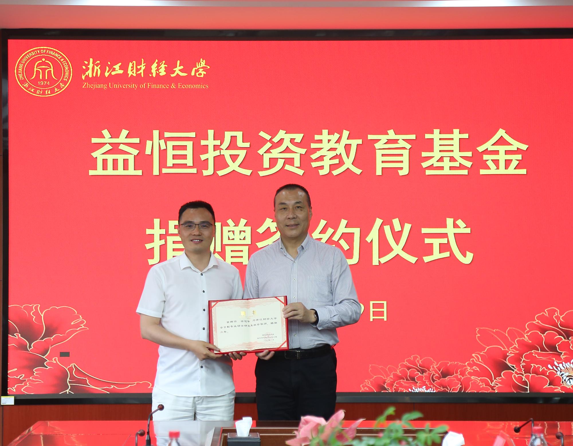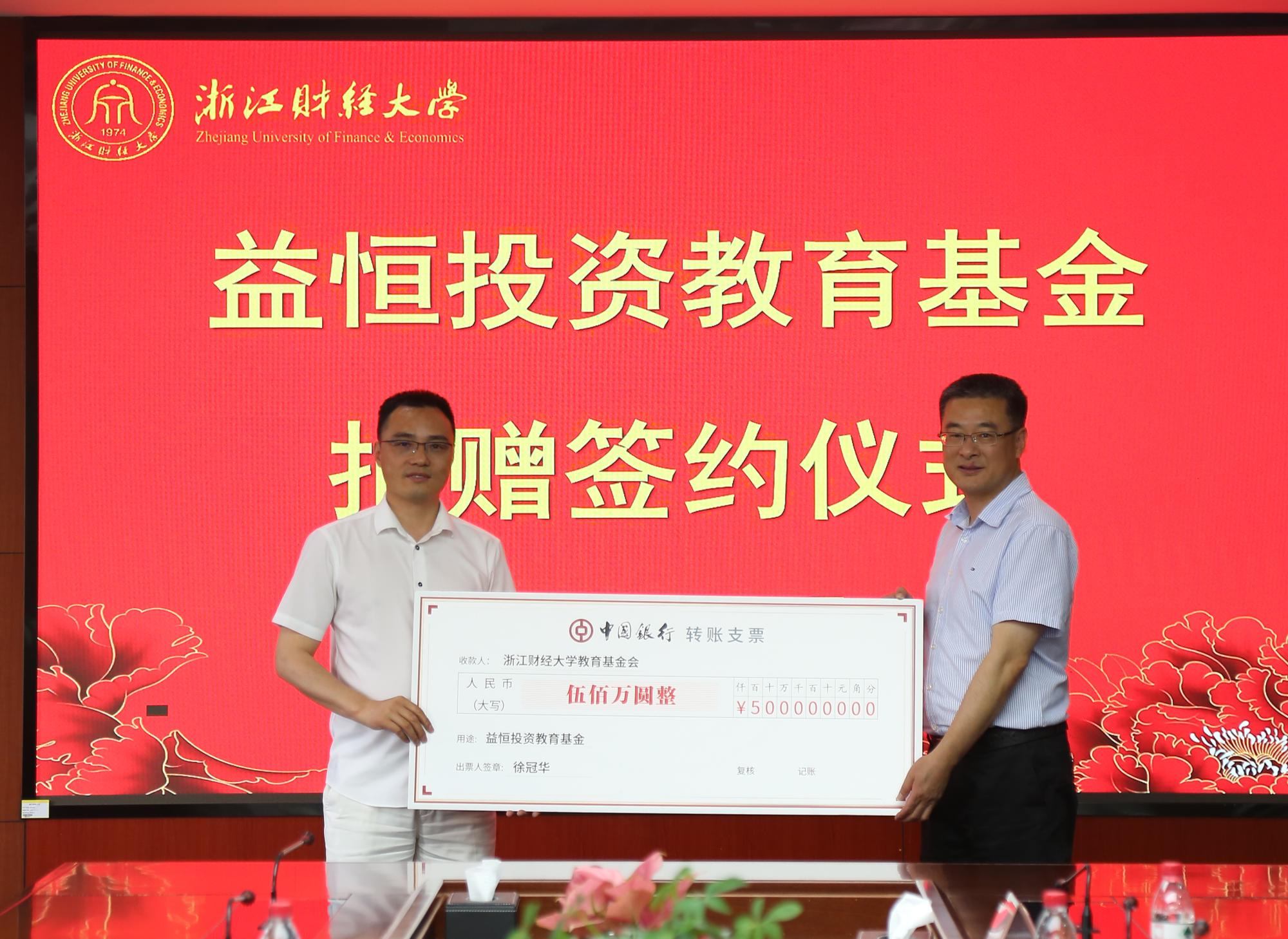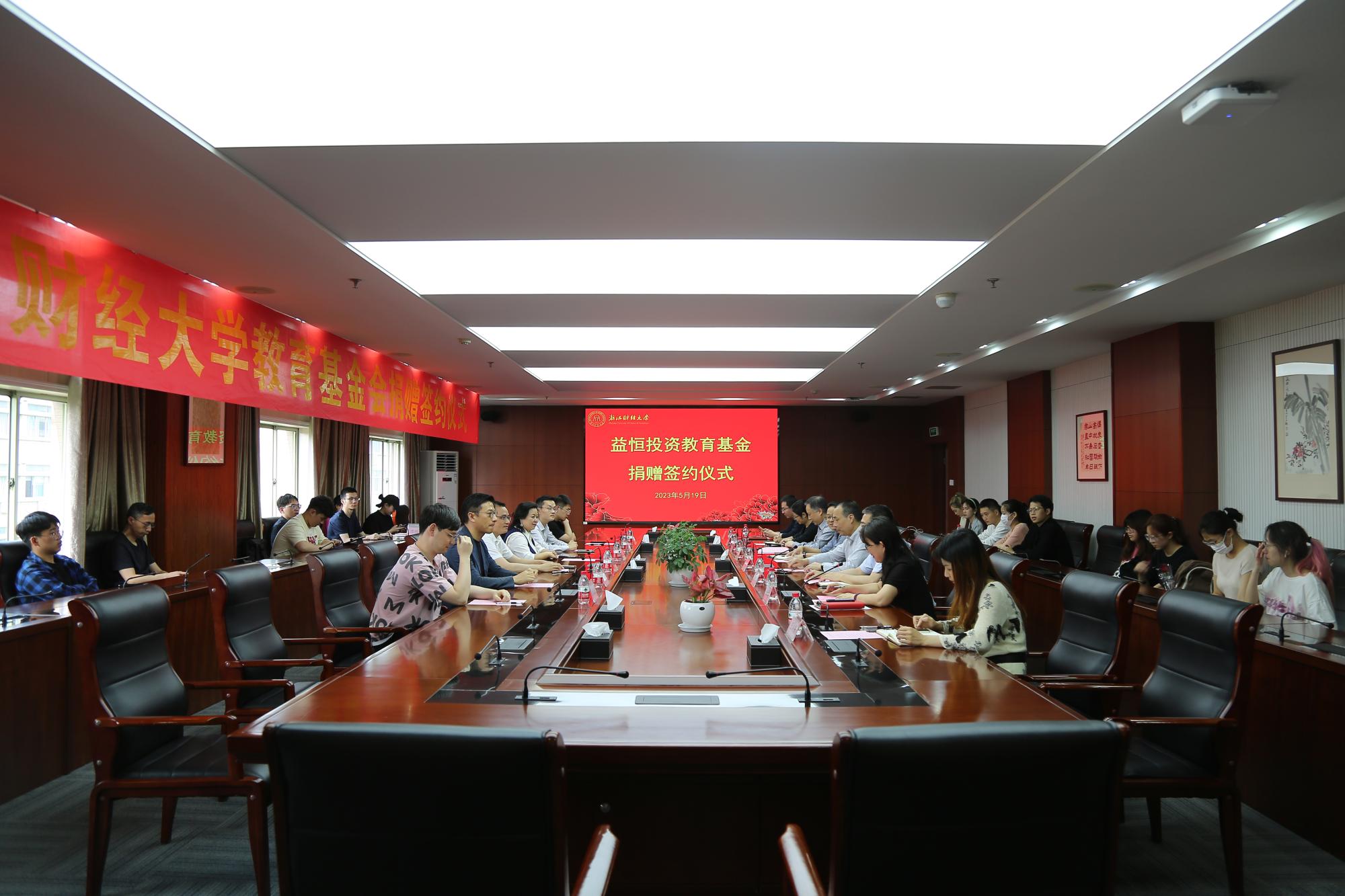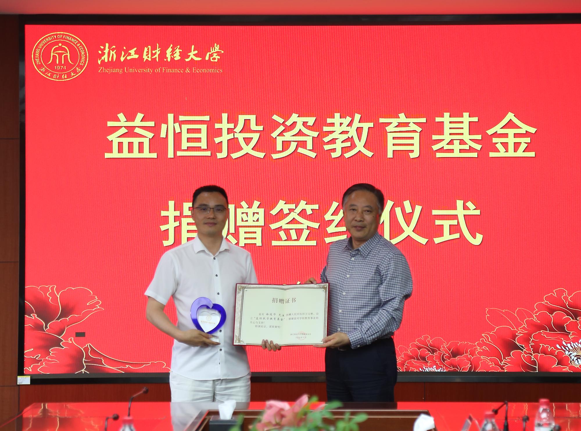 5月19日下午,“益恒投资教育”基金捐赠签约仪式在校行政楼412举行。2003届证券投资专业校友徐冠华向猫都论坛 捐赠500万元,设立“益恒投资教育”基金。校党委书记李金昌,党委委员、副校长徐晓东,浙江益恒投资管理有限公司董事长徐冠华、联合创始人吴丹,浙江海达国际文教信息有限公司董事长张坚,浙江银万斯特投资管理有限公司董事长杜飞磊,浙江益恒投资管理有限公司交易总监章永成、研究总监田黄达,党委办公室主任范建锋,社会合作办主任张红英,猫都论坛 党委书记蔡国金等出席仪式。