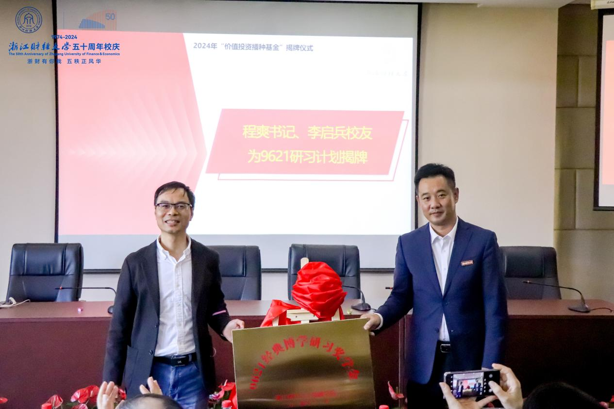 最后,在热烈的掌声中,校党委副书记程爽、校友李启兵共同为“9621经典博学研习奖学金”揭牌。