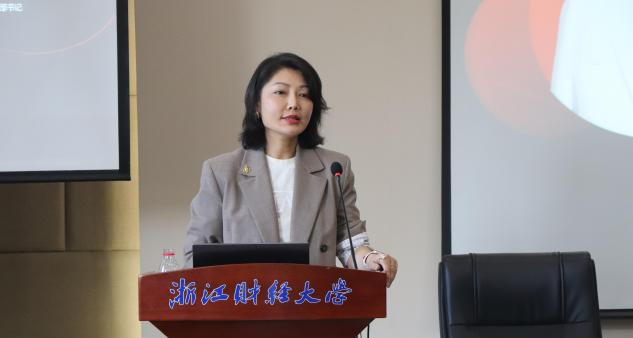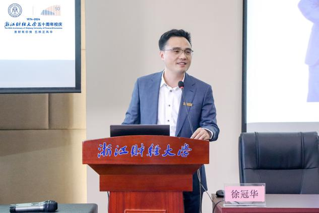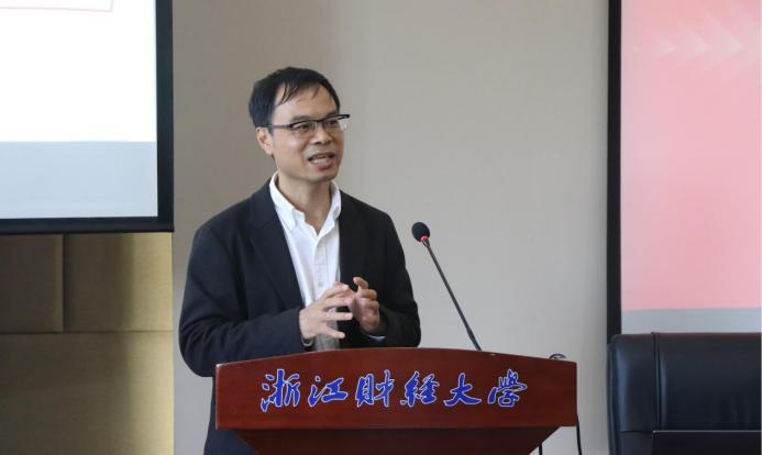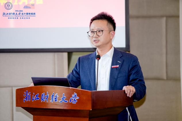 接着,浙江盈阳资产管理有限公司董事、副总经理陈智杰讲话。他提到,“盈阳金融突出贡献奖”设立的初心是激励教师提高课程教学质量、提升科研与社会建设水平。在广大师生校友的关切和支持下,学院学科专业建设已取得显著突破,育人体系搭建已取得傲人成绩。他衷心祝愿学院和学校越办越好,为社会输送更多顺应时代发展、适应市场变化的综合型金融人才。