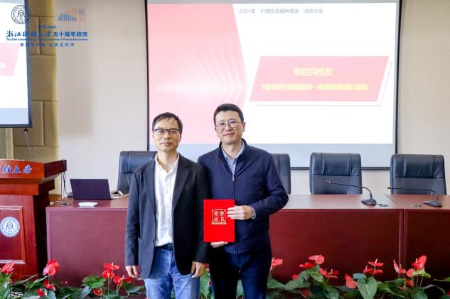 退休教师、原学院常务副院长楼远,上海浙石期货经纪有限公司副总经理、工会主席、天天开心读书会创始人、1998届校友尚晓铭,杭州凯风科技有限公司总经理、1998届校友李启兵,金元证券股份有限公司浙江分公司总经理、1998届校友何华,盈阳金融科技学院副院长、1999届校友孔繁岗,物产中大期货有限公司财富管理中心总经理、2001届校友沈骅,天津市基金业协会、2001届校友李亚明,浙江益恒投资管理有限公司董事长、2003届校友徐冠华,杭州蜗牛投资管理有限公司总经理、2004届校友褚元杰,浙江银万斯特股权投资管理有限公司总经理、2005届校友杜飞磊,天蓝星资本管理合伙人、2005届校友楼江,浙江鼎源投资管理有限公司董事长、2005届校友戴中坚,浙江盈阳资产管理股份有限公司董事、副总经理、2016届校友陈智杰,学院党委书记黄文礼,副院长金骋路、副院长林祺,盈阳金融科技学院副院长傅俊辉等领导、嘉宾,以及校友、师生代表参加,颁奖大会由陈思佳主持。