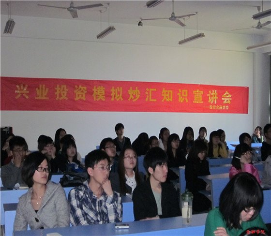 在B306教室为炒汇爱好者举办了外汇知识宣讲会,特邀著名投资公司兴业投资的首席分析师吴迪先生为大家揭开黄金投资和外汇的神秘面纱,分享投资心得,向大家展现外汇投资的魅力。