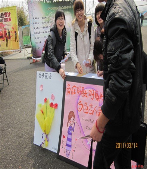 在保单推广现场,贴着一张大大的海报,其间留下的大片空白正是留给来参加爱情保单活动的情侣来填写姓名的。新奇的现场布置和个性的保单设置吸引了过往路人的注意。活动一开始便受到了不少情侣的关注与支持,空白的海报很快就写满了一对对情侣的名字。借白色情人节之名“炒作”爱情保单,保险学会的目的正是通过这样新颖别致的方式,致力于让更多人了解保险、关注保险,增强保险意识。通过这次活动,不仅仅是保险学会的同学,也让更多其他的同学加深了对保险的印象,了解了保险的基本知识。
