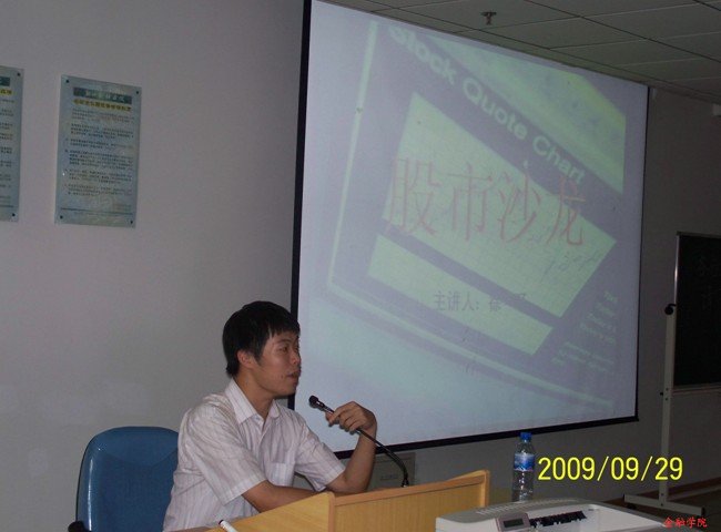 9月29日下午,金融学会本学期的第一期股市沙龙在E楼拉开了帷幕,本次活动主要是由学会资深学术主讲为大家讲述近几十年间中国股市的风雨历程。整个活动分为上下两部分,上篇:“二十年潮起潮落,五千日跌宕轮回”,在主讲的带领下,我们一同回顾了中国股市从开始到现在二十年间的起起伏伏;回顾历史之后就是对未来的展望,在活动的后部分,我们跟随着学长的讲解,我们了解了股市的现状以及今后的发展趋势,尤其在受金融危机严重冲击的当今股坛,我们该如何穿透迷雾,直击真实,成为在风浪下屹立的股界翘楚!