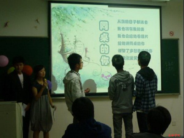 最后一个环节“红歌争霸赛”,金融1班的毛琼、陈文俊同学凭着《我的中国心》和《中国人》分别获得了最佳台风奖和“歌词大人”的称号。