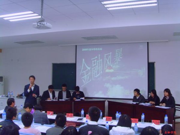 紧接着,这场主题为“金融风暴中的大学生——危机离我们有多远?”的金融风暴终于“爆发”了。这次的金融风暴一改以往模式。在一个又一个生动又现实的情景剧后,讨论主题依次呈现,“大学生该不该炒股?”,“金融学子路在何方?”,“中国中小企业将何去何从?”,“政府到底该不该援助中小企业?”。台上金鹰会员观点鲜明,见解独到,侃侃而谈。而后嘉宾老师站在自己的角度上提出了自己的一番见解,为学生们指点迷津。随着讨论的话题愈加接近同学们的生活,同学们愈感兴趣,共鸣也越多,掌声迭起。中间的互动环节,同学们更是踊跃参加。最后,在一片掌声中,公司金融学会年终特别活动取得圆满的成功。
