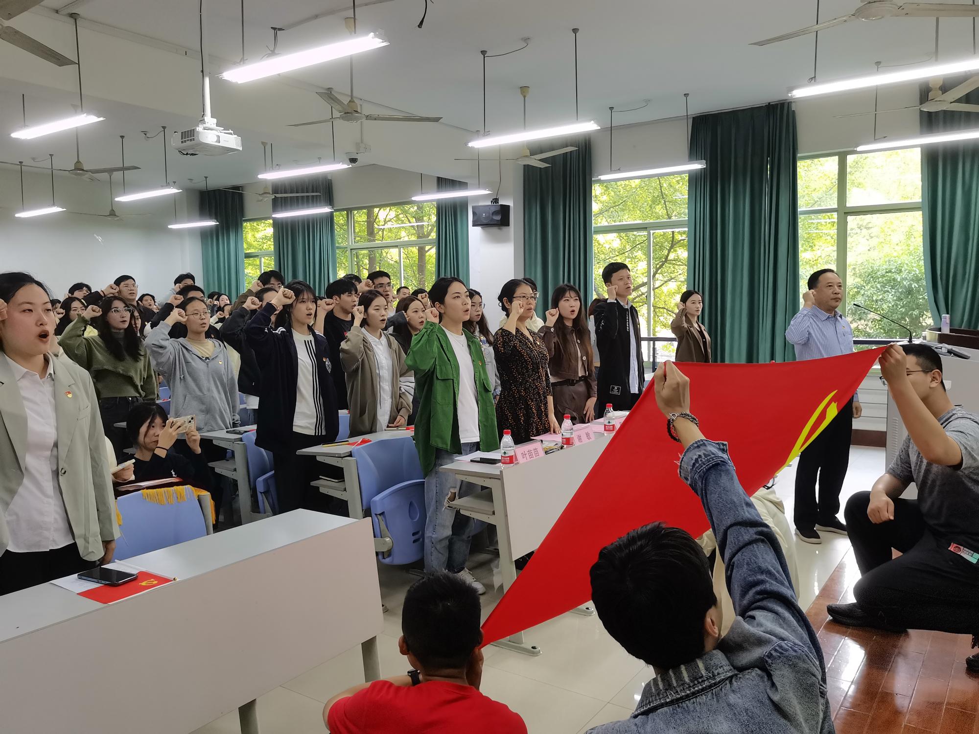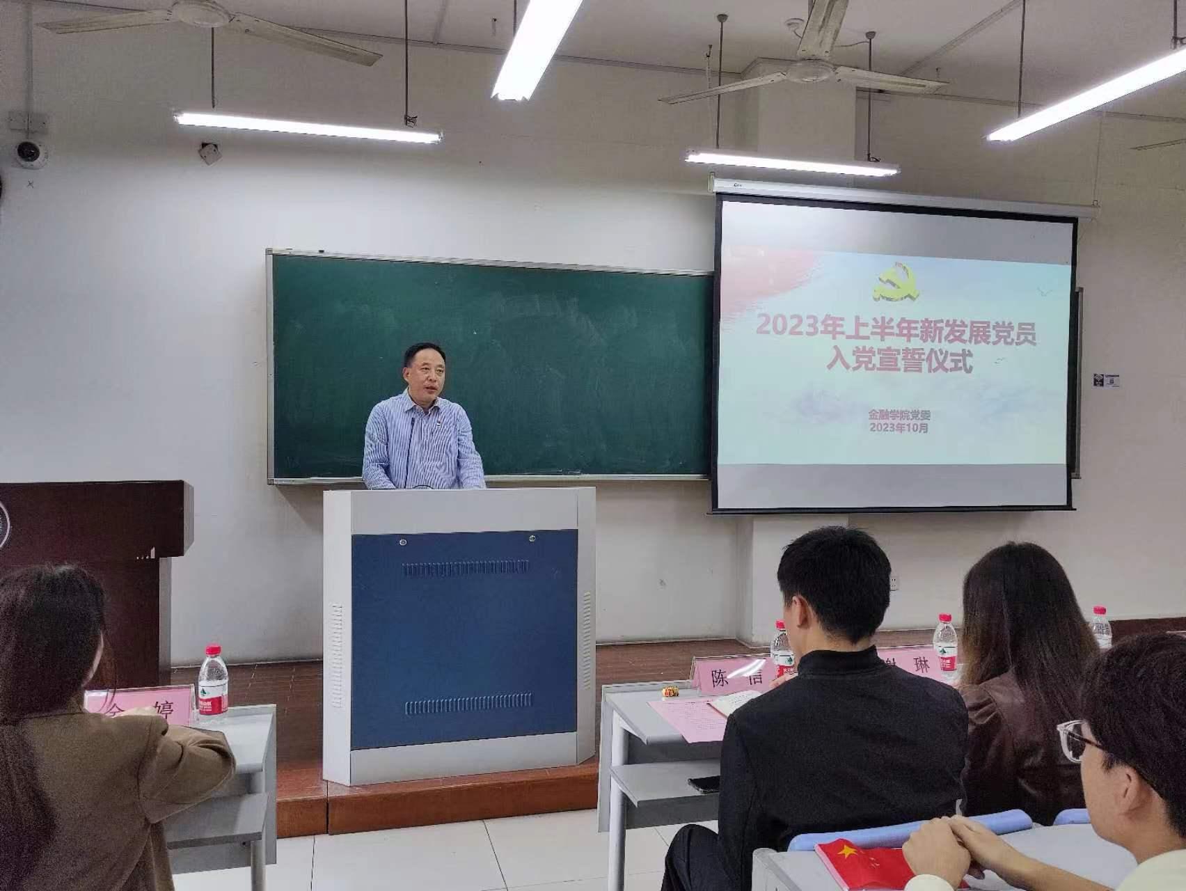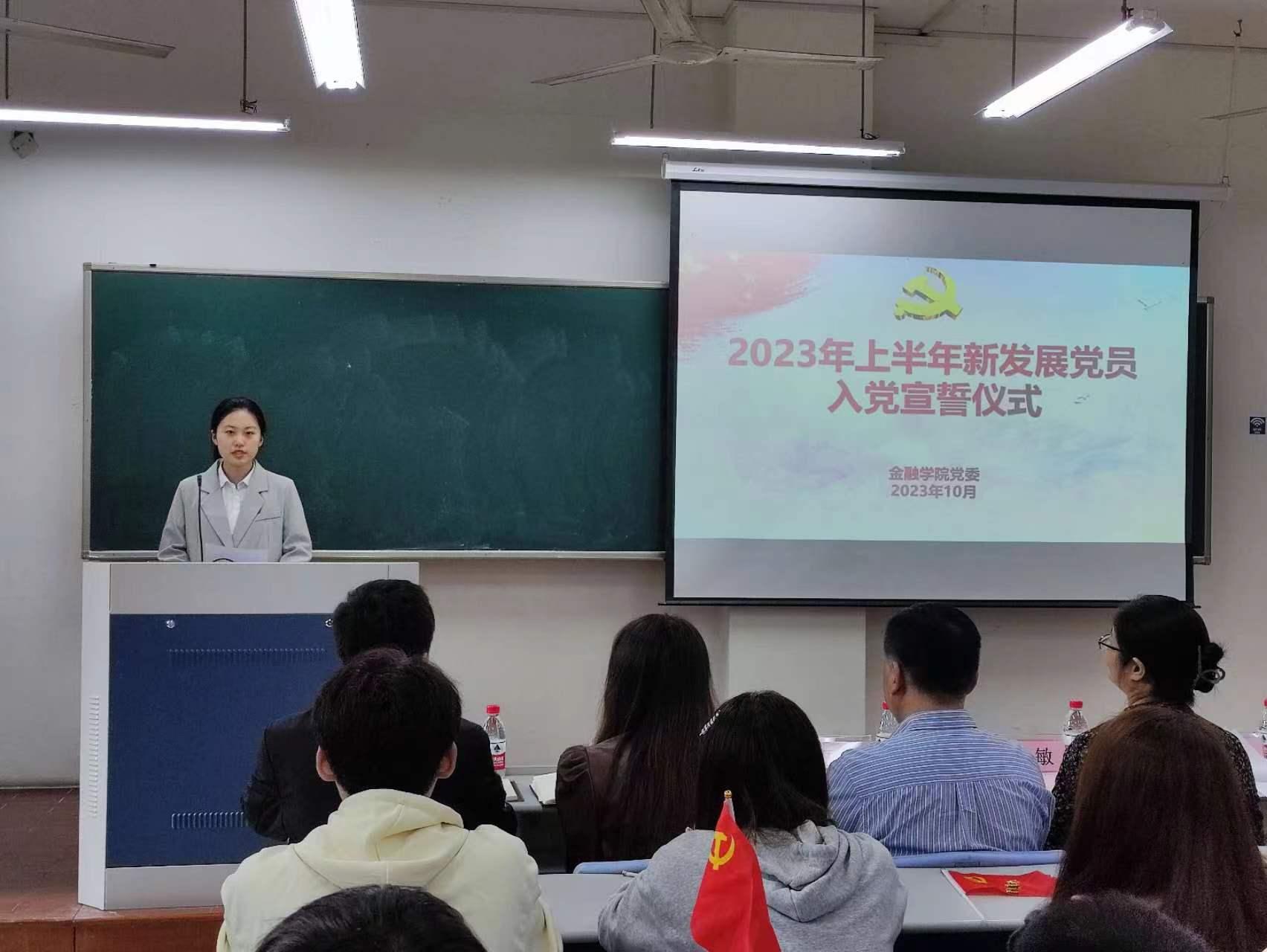 党委在学院楼104教室举行2023年上半年新发展党员入党宣誓仪式。学院党委书记蔡国金、党委副书记谢敏、各学生党支部书记、党建指导老师、各支部支委、老党员代表及全体新发展党员出席了本次仪式。仪式由专职组织员翟丽媛主持。