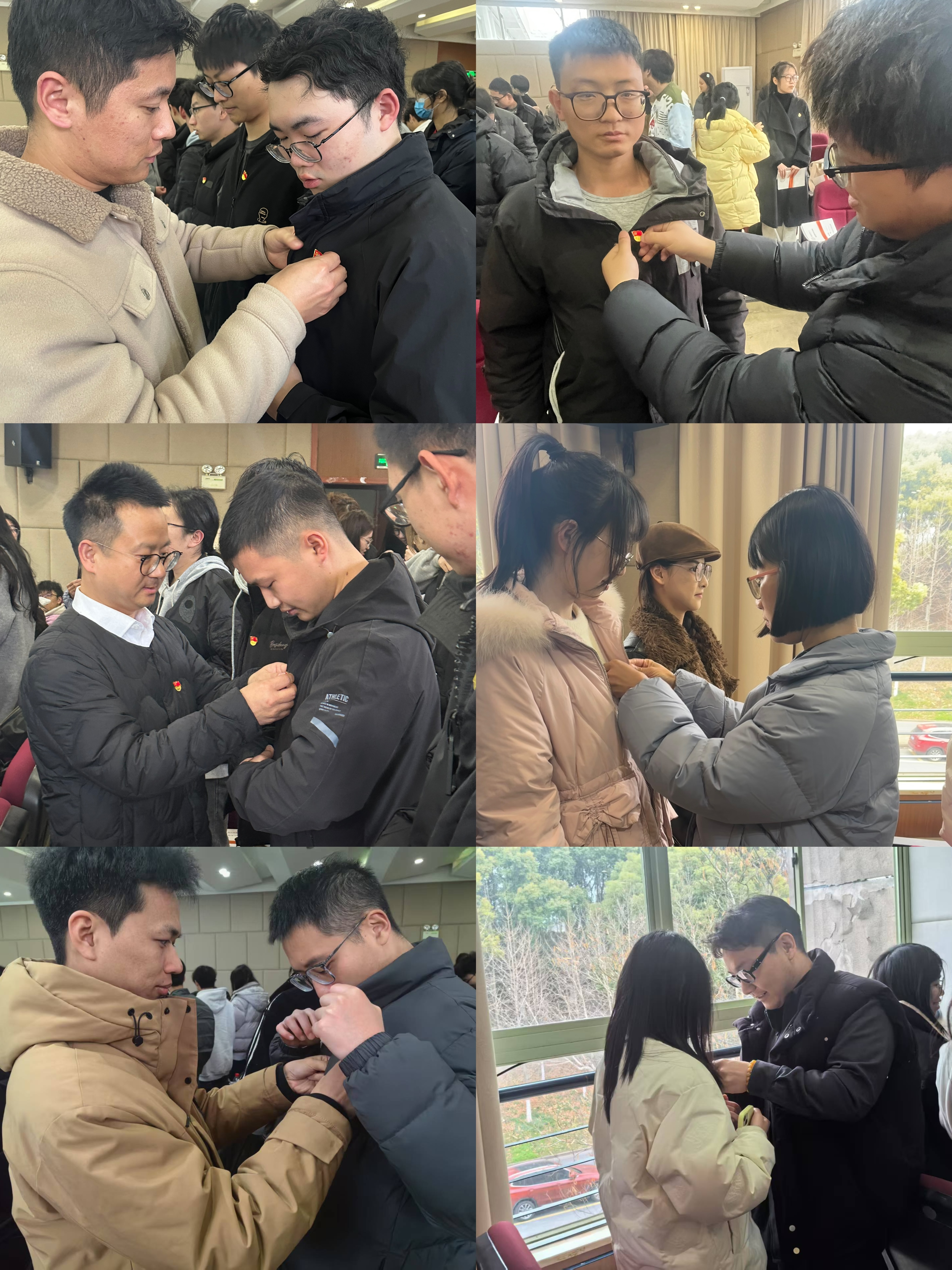 与会老党员为新发展党员佩戴党徽。新老传承,赓续绵延。通过佩戴党徽的仪式感,让每一位新发展党员亮明身份、强化意识、树好形象。
