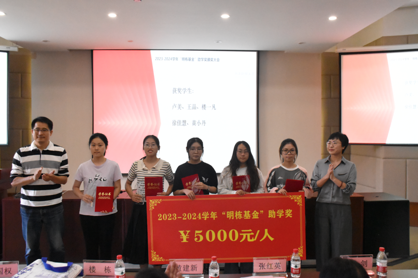 11月4号下午,一年一度校友返校日之际,2023-2024学年“明栋基金”助学奖颁奖大会在猫都论坛 202报告厅隆重举行。 校党委副书记黄建新,学院原副院长夏红芳,院退休教师徐敏,浙江盈阳资产管理股份有限公司创始人、“明栋基金”捐赠人代表楼栋,“明...